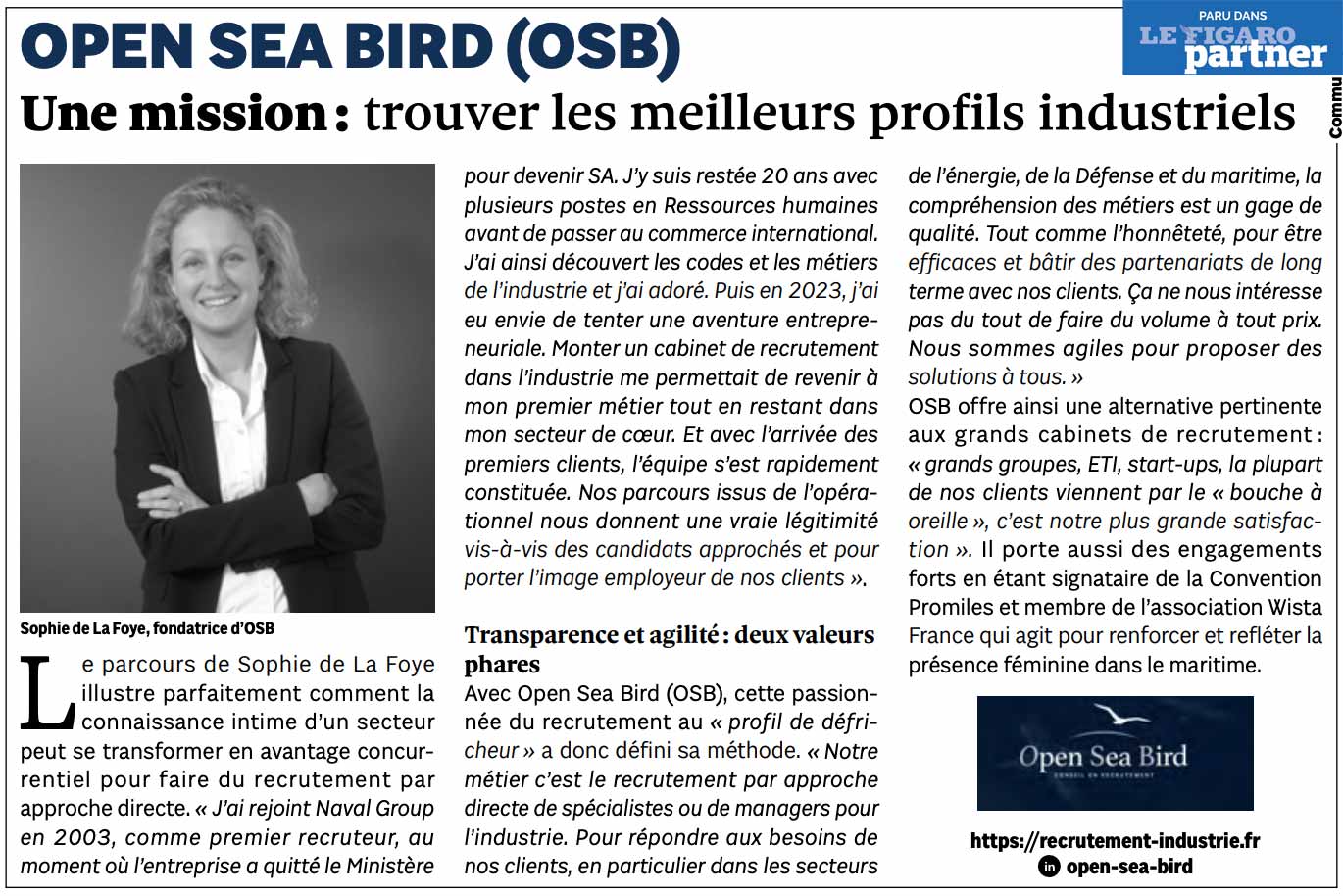 De retour en France, je me suis lancée dans une aventure entrepreneuriale pour mettre mes compétences au service des entreprises qui recrutent, en créant Open Sea Bird (OSB) en 2023. »